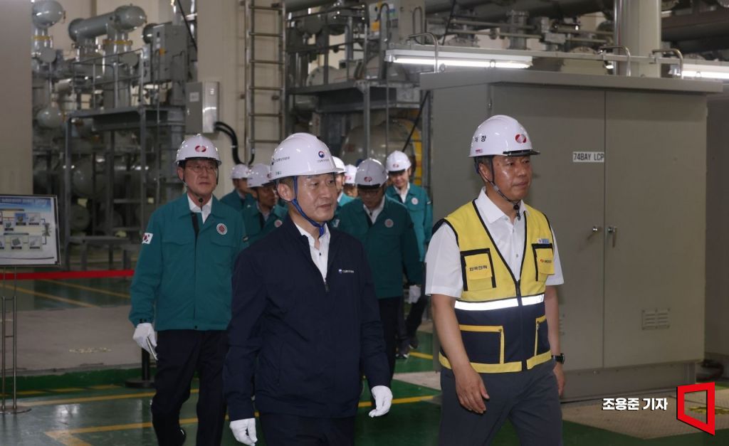 이호현 산업통상자원부 2차관을 비롯해 발전 유관기관장들이 8일 서울 서초구 신양재 변전소에서 여름철 전력수급 준비상황 현장점검을 하고 있다. 이날 서울 낮 최고기온이 영상 36도를 넘기며 올들어 가장 높은 기온을 기록했다.
