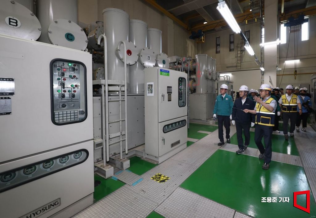 이호현 산업통상자원부 2차관을 비롯해 발전 유관기관장들이 8일 서울 서초구 신양재 변전소에서 여름철 전력수급 준비상황 현장점검을 하고 있다. 이날 서울 낮 최고기온이 영상 36도를 넘기며 올들어 가장 높은 기온을 기록했다.
