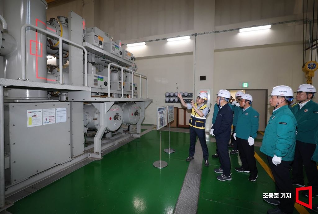 이호현 산업통상자원부 2차관을 비롯해 발전 유관기관장들이 8일 서울 서초구 신양재 변전소에서 여름철 전력수급 준비상황 현장점검을 하고 있다. 이날 서울 낮 최고기온이 영상 36도를 넘기며 올들어 가장 높은 기온을 기록했다.