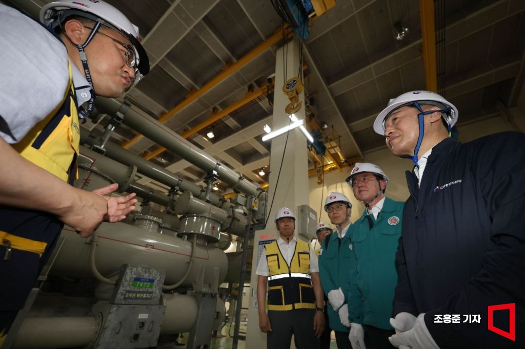 이호현 산업통상자원부 2차관을 비롯해 발전 유관기관장들이 8일 서울 서초구 신양재 변전소에서 여름철 전력수급 준비상황 현장점검을 하고 있다. 이날 서울 낮 최고기온이 영상 36도를 넘기며 올들어 가장 높은 기온을 기록했다.