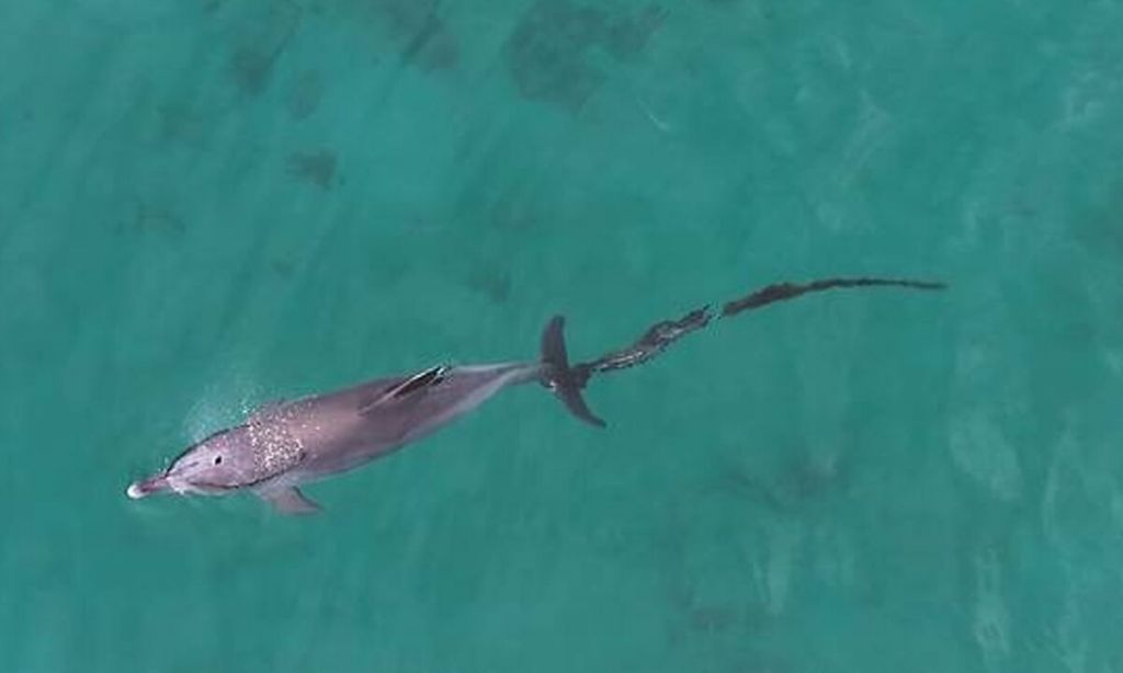 지난 6월 9일 꼬리에 폐어구가 얽힌 채 목격된 남방큰돌고래 ‘행운이’. 다큐제주, 제주대학교 고래·해양생물보전연구센터 제공