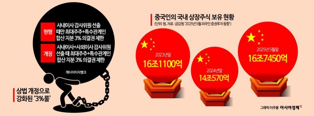 손승우 법무법인 율촌 지식재산권·기술 고문은 "3% 룰로 인해 재계가 가장 우려하고 있는 부분이 '경영권 방어'"라며 "(그 속에는) 경영권을 지키지 못하는 극한의 상황에 이르렀을 때 발생될 수 있는 기술 유출에 대한 우려도 있다"고 말했다. 중국 기업들은 전 세계적으로 기술 확보에 사활을 걸고 있어, 국내 진입도 더 민감하게 받아들여지고 있다. 금융감독원에 따르면 지난 5월 말 기준 중국 투자자(법인 포함)가 보유한 국내 상장주식은 16조7450억 원으로, 전년보다 19.1% 늘었다. 다국적 컨소시엄, 사모펀드, 싱가포르·동남아 자회사를 앞세운 우회 투자도 많아 실제 규모는 더 클 것으로 추정된다.