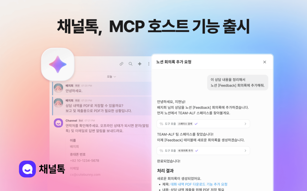 인공지능(AI) 비즈니스 메신저 '채널톡'을 운영하는 채널코퍼레이션은 사내 업무 보조용 AI 툴 '팀 알프'에 업무 자동화 환경 구축을 위한 MCP(Model Context Protocol) 호스트 기능을 출시했다고 9일 밝혔다. MCP는 미국의 생성형 AI 스타트업 앤트로픽이 지난해 11월 자사 서비스 '클로드'를 통해 제안한 AI 시스템과 외부 데이터 소스를 연결하는 통합 표준으로, AI가 단순히 주어진 정보로 질문에 답하는 것을 넘어 외부 문서를 불러오거나, 이메일을 발송하는 등 '행동하는 주체'가 되도록 지원한다.