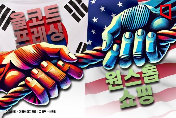 한미 간 통상·안보 등 주요 현안을 해결하기 위해 전방위로 나선 한국 정부의 이른바 '올코트 프레싱(전면 압박)' 전략이 미국 도널드 트럼프 행정부의 '원스톱 쇼핑' 전략과 팽팽한 줄다리기 양상으로 흐를 가능성이 커지고 있다. 트럼프 미국 대통령이 7일(현지시간) 이재명 대통령에게 8월 1일부터 상호관세 25%를 적용하겠다는 내용의 '관세 서한'을 발송하고 하루 만에 주한미군 방위비를 언급하며 양상은 더욱 분명해졌다. 대통령실은 서두르지 않으면서도 앞으로 남은 3주간 관계부처와 국익을 관철하기 위한 구체적인 협상 전략을 수립하는 데 집중할 계획이다.