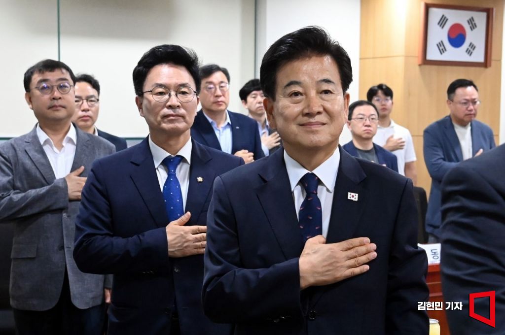 정동영 통일부 장관 후보자가 9일 국회 의원회관에서 열린 AI G3 강국 신기술 전략 조찬 포럼에서 국민의례를 하고 있다.