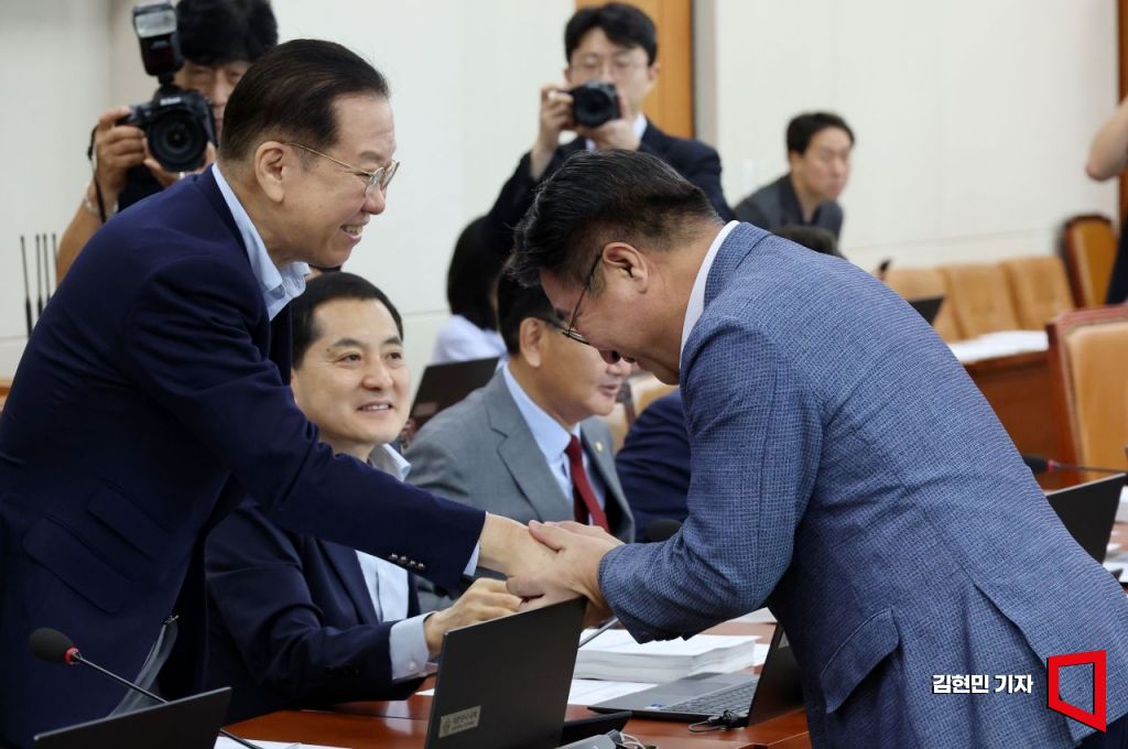 9일 국회에서 열린 기획재정위원회 전체회의에 윤호중 행안부 장관 후보자가 권영세 국민의힘 의원과 인사하고 있다.