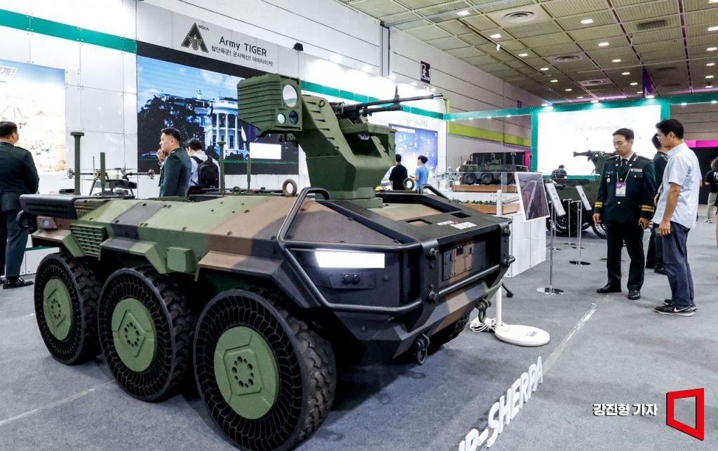 9일 서울 강남구 코엑스에서 열린 '2025 무인이동체산업엑스포'에서 육군 부스에 무인장비가 전시돼 있다.