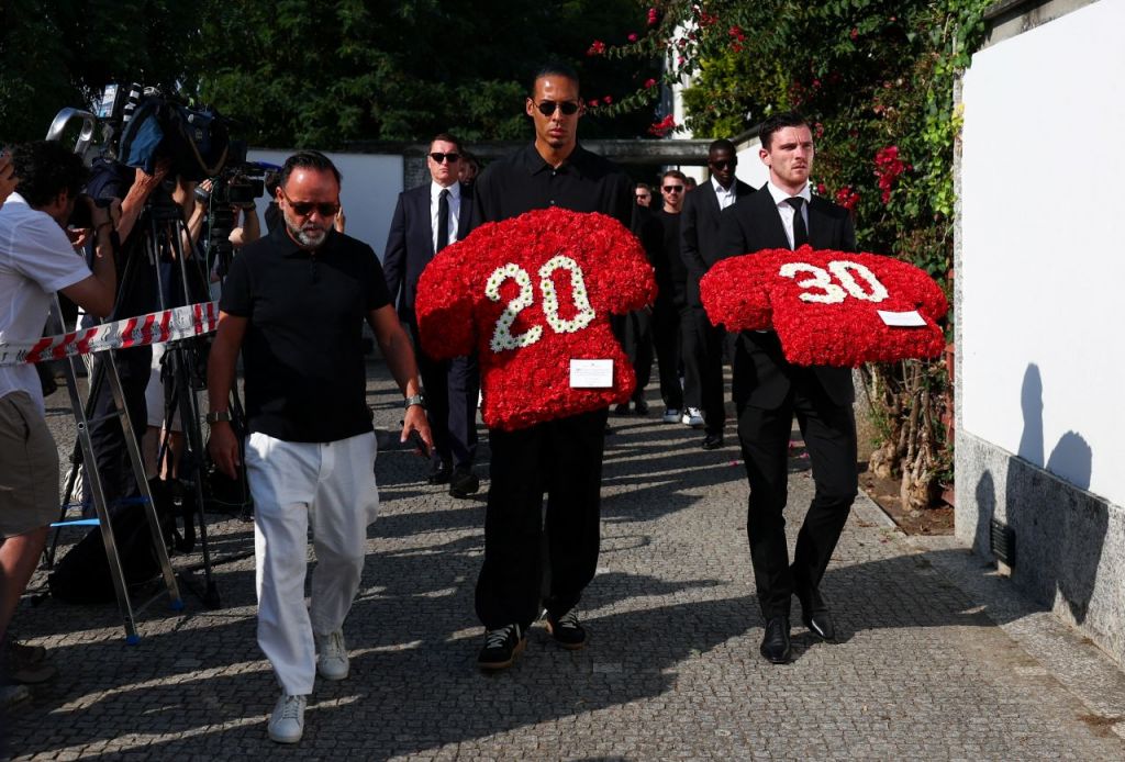 리버풀의 주장 버질 반 다이크와 앤드류 로버트슨이 지난 5일 스페인 사모라 근처에서 교통사고로 사망한 리버풀의 포르투갈 축구 선수 디오구 조타와 그의 동생 안드레 실바의 장례식에 도착하고 있다. 로이터 연합뉴스