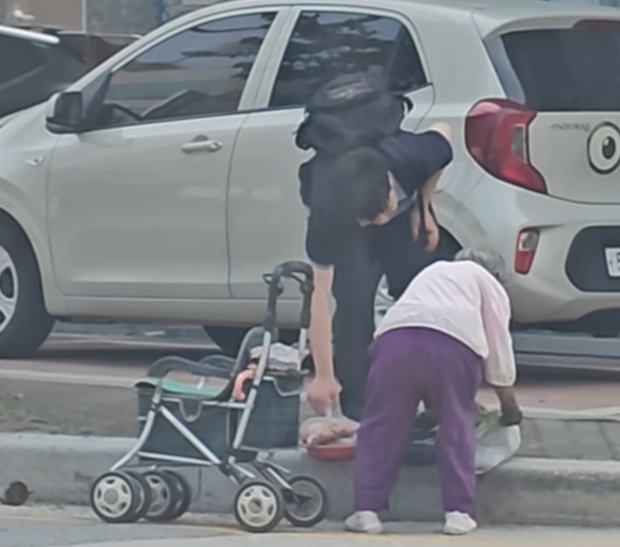 영상에서 학생은 바지 주머니를 뒤적거리며 난감해하는 표정을 짓기도 한다. 연이어 남학생은 물건을 받지 않아도 된다는 듯 손을 내젓지만 할머니의 권유에 결국 콩이 든 봉지를 집어 들고 간다. 당시 경기 동두천시 최고 기온은 33도, 습도가 85%에 달하는 무더운 날씨였다.