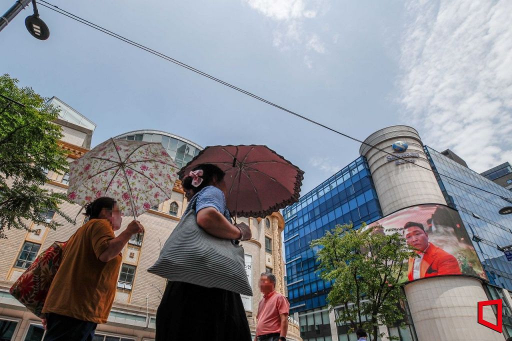 서울 중구 명동에서 시민들이 양산으로 햇볕을 가리고 있다. 강진형 기자