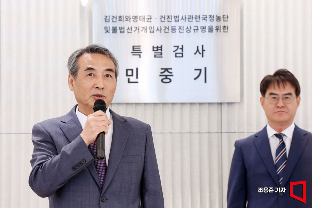 윤석열 전 대통령의 부인 김건희 여사 의혹 관련 사건을 맡은 민중기 특별검사가 2일 서울 종로구 KT광화문빌딩 웨스트에 마련된 특검 사무실에서 열린 현판 제막식에서 인사말을 하고 있다. 2025.7.2 조용준 기자