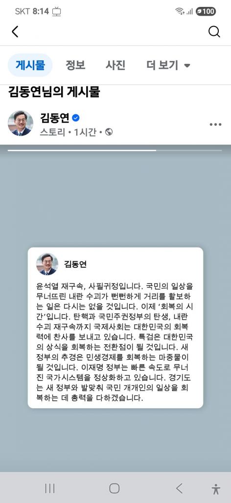 김동연 지사는 10일 자신의 사회관계망서비스(SNS)에 올린 글에서 "윤석열 재구속, 사필귀정"이라며 "국민의 일상을 무너뜨린 내란 수괴가 뻔뻔하게 거리를 활보하는 일은 다시는 없을 것"이라고 말했다.