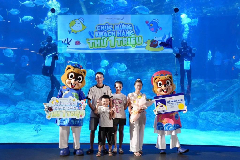 롯데월드 아쿠아리움 하노이가 누적 관람객 100만명 달성을 기념해 100만번째 입장 가족 손님과 기념촬영하고 있다. 롯데월드 제공