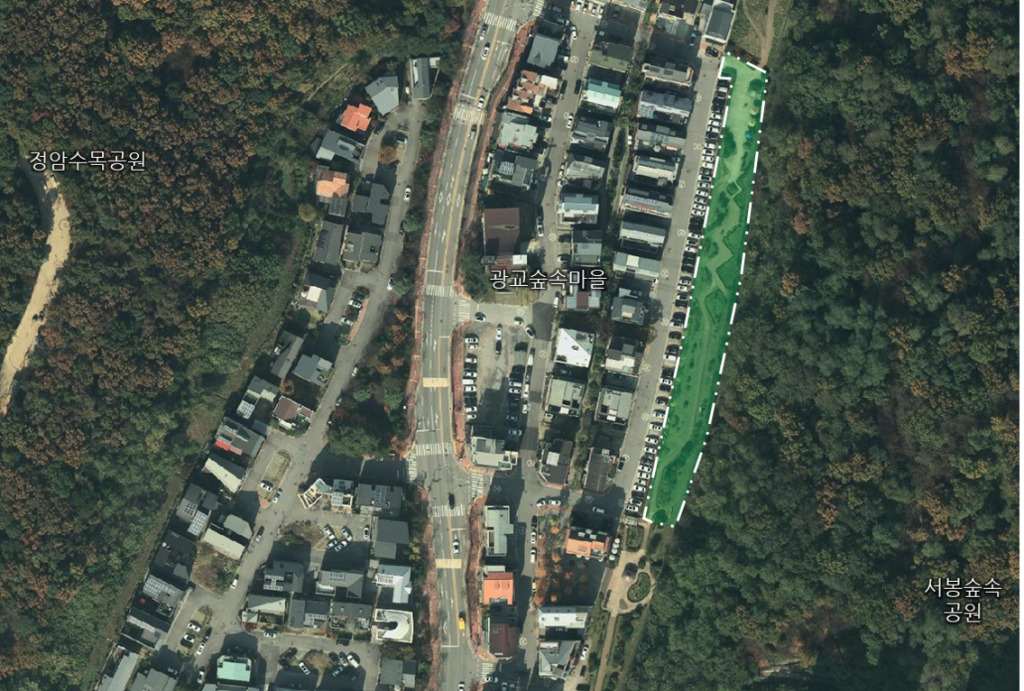 휴식은 물론 주민 축제 등이 가능하도록 재정비하는 용인시 수지구 상현동 '광교숲속마을 쉼터' 위치도. 용인시 제공