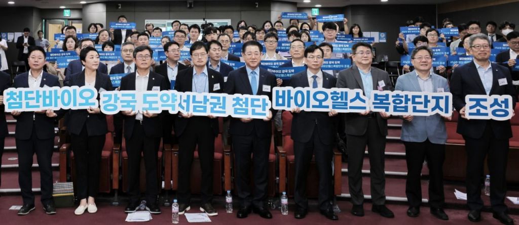 광주시는 지난 9일 국회의원회관 제2소회의실에서 전남도와 공동으로 '서남권 첨단 바이오헬스복합단지 조성 전략 포럼'을 개최했다. 이날 포럼에서 참석자들은 '첨단바이오 강국 도약! 서남권 첨단 바이오헬스복합단지 조성' 구호를 외치며 지역 간 상생 협력과 바이오헬스 국가균형발전의 결의를 다졌다. 광주시 제공
