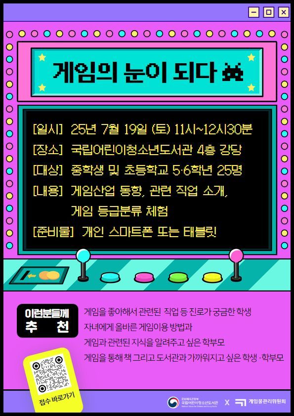 '게임의 눈이 되다!'는 국립어린이청소년도서관 누리집에서 선착순 모집하며, 참가비 없이 무료로 진행된다. 프로그램에 대한 자세한 내용은 국립어린이청소년도서관 누리집에서 확인할 수 있다.