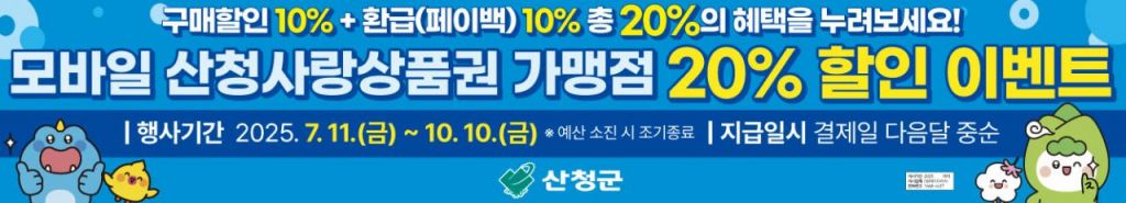여기에 제로페이 앱을 통해 산청사랑상품권 구매 시 기존 제공하던 10% 할인을 추가하면 최대 20%의 할인 혜택을 받을 수 있다. 페이백 행사는 11일부터 10월 10일까지로 예산(약 6억원) 소진 시 조기 마감될 수 있다.