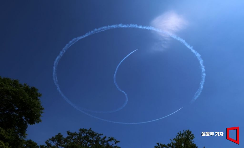 공군 특수비행팀 블랙이글스가 10일 서울 상공에서 태극문양을 그리고 있다. 블랙이글스 비행팀은 오는 12일 반포한강공원에서 열리는 방위산업의 날에 참가한다.