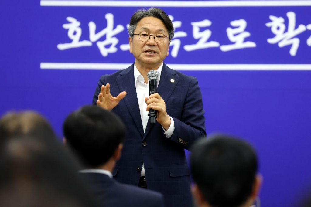 지난 1일 광주 북구 비엔날전시관 거시기홀에서 열린 호남고속도로 확장사업 주민토론회에서 강기정 광주시장이 발언하고 있다. 연합뉴스