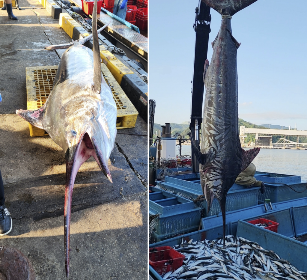 제주도·남해를 비롯해 따듯한 해역에서 서식하는 황새치가 강원 삼척 앞바다에서 잡혔다.