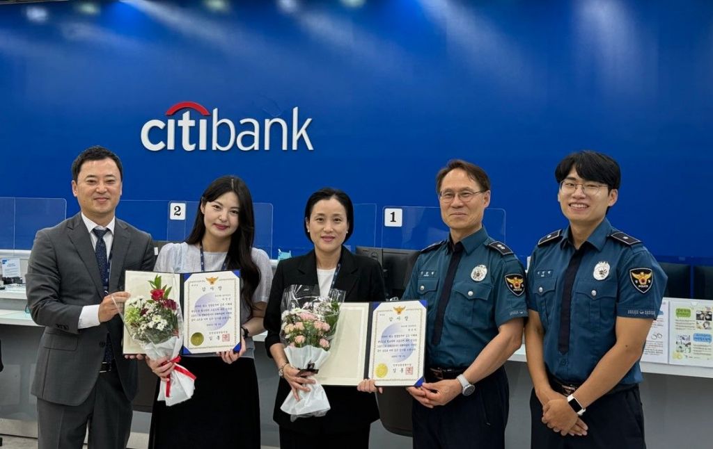 한국씨티은행이 9일 경인영업부 소속 직원 2명이 보이스피싱 범죄를 현장에서 인지하고 경찰 신고를 통해 인출책 검거에 기여한 공로로, 인천남동경찰서로부터 감사장을 받았다고 밝혔다.