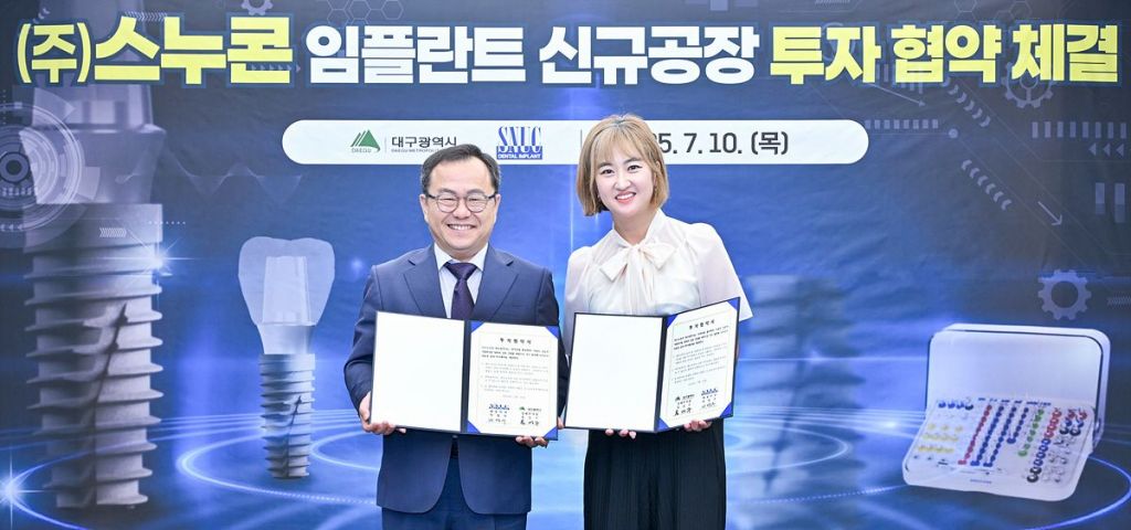 대구시는 10일 대구시청 산격청사에서 임플란트 글로벌 강소기업인 ㈜스누콘(대표 박영우)과 치과용 임플란트 신규공장 2개소 건립을 위한 투자협약을 체결했다.
