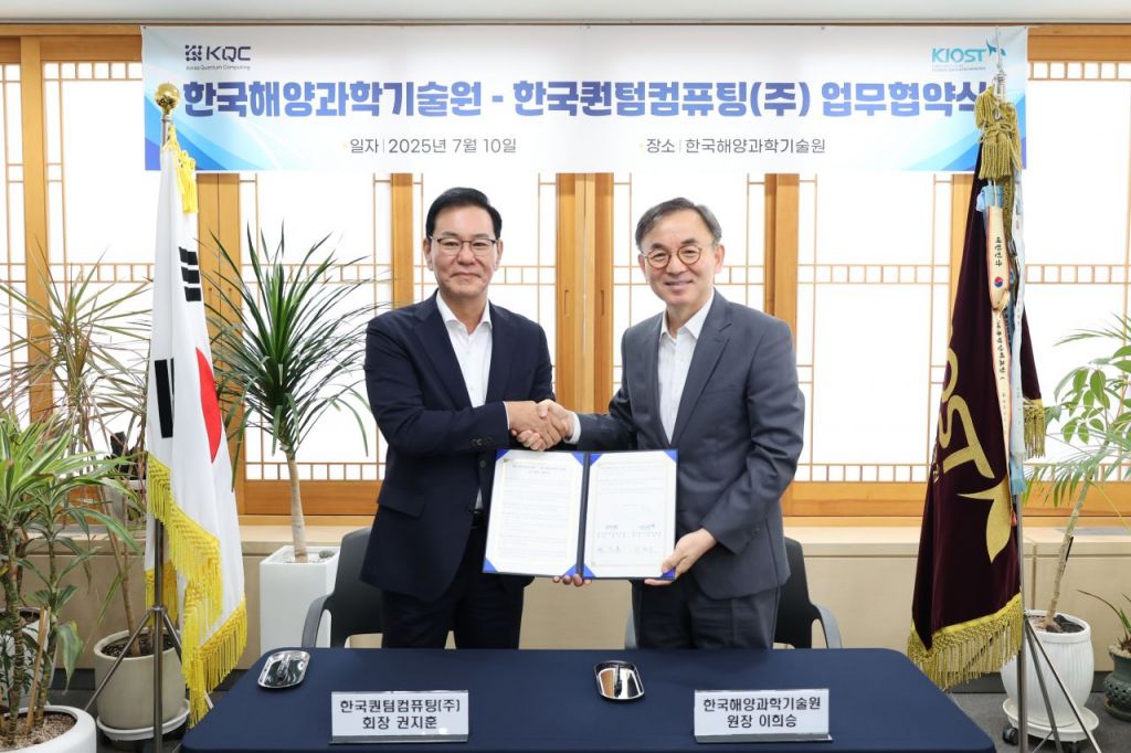 한국해양과학기술원(원장 이희승, KIOST)은 한국퀀텀컴퓨팅(회장 권지훈, KQC)과 공동으로 10일 KIOST 부산 본원(부산시 영도구 소재)에서 해양연구 분야에 양자컴퓨팅 기술을 접목해 과학기술·디지털 기반의 성장 동력을 강화하는 데 기여하고자 업무협약을 체결했다.