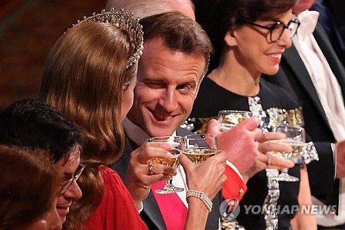 8일 영국 국빈 만찬장에서 프랑스 마크롱 대통령이 영국 케이트 미들턴 왕세자빈에게 윙크하는 모습. 연합뉴스