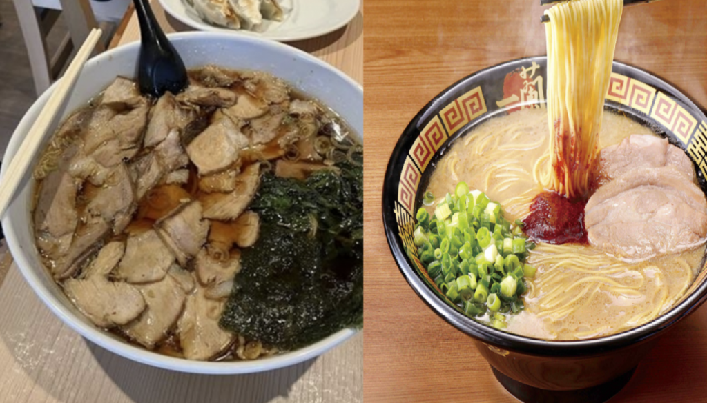 이시바 시게루 일본 총리가 공개한 라멘 사진(왼쪽)과 일본 라멘 프랜차이즈 이치란의 돈코츠라멘. X캡처