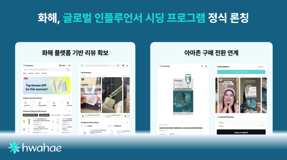 이번 프로그램은 K뷰티 브랜드들이 K뷰티에 관심이 높은 해외 인플루언서에게 제품을 시딩하고, 인플루언서는 제품을 체험한 뒤 리뷰 영상을 자신의 틱톡(TikTok) 계정에 올리는 방식으로 진행된다. 해당 콘텐츠는 화해 글로벌 웹 내의 제품 상세 페이지에 노출되며, 아마존 구매 링크로도 연결돼 구매 전환율 향상을 유도한다는 계획이다.
