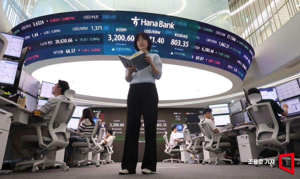 국내 증시 시가총액이 사상 처음으로 3000조원을 넘어선 가운데 코스피 지수도 3년10개월만에 3200선을 돌파 사상최고가를 기록한 11일 서울 중구 하나은행 딜링룸 모니터에 코스피 지수가 표시돼 있다. 이날 코스피는 전장보다 3.12포인트(0.10%) 오른 3,186.35로 출발했다.