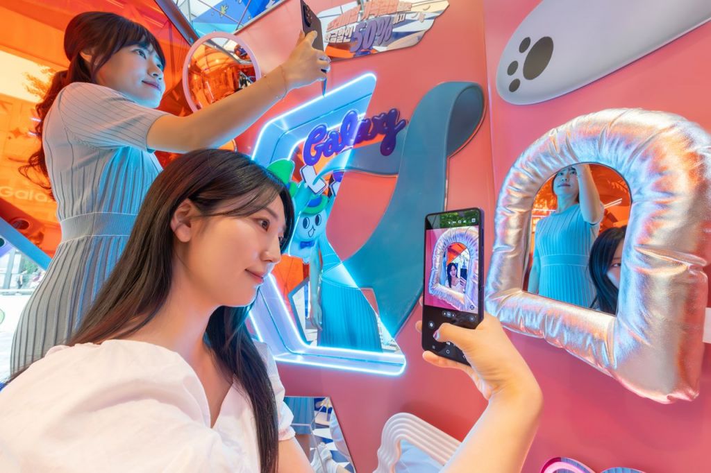 모델들이 KT 홍대 애드샵 플러스에 마련된 ‘갤럭시 Z 폴더블7 AI 체험존’에서 AI 기반 콘텐츠를 체험하고 있다. 사진=KT
