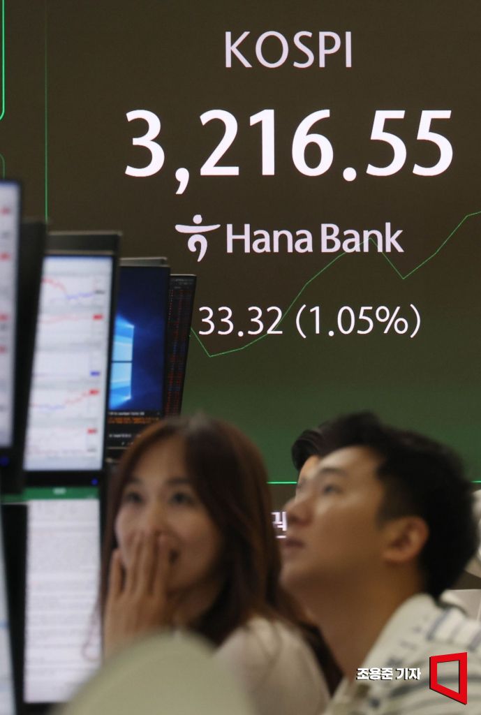 국내 증시 시가총액이 사상 처음으로 3000조원을 넘어선 가운데 코스피 지수도 3년10개월만에 3200선을 돌파 사상최고가를 기록한 11일 서울 중구 하나은행 딜링룸 모니터에 코스피 지수가 표시돼 있다. 이날 코스피는 전장보다 3.12포인트(0.10%) 오른 3,186.35로 출발했다.