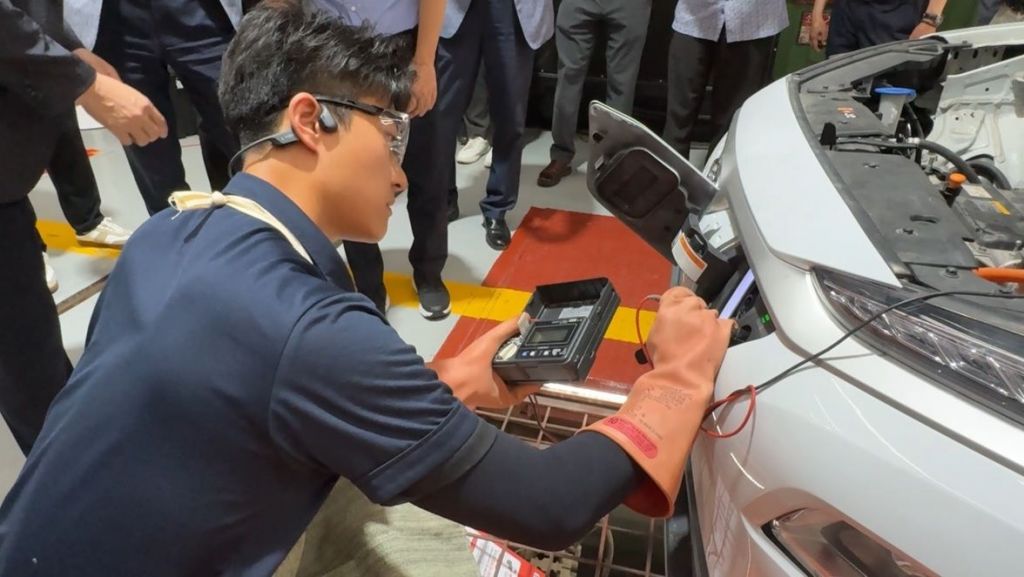 교통안전공단 해운대검사소에서 직원이 전기차 충전구 절연저항 검사를 시연하고 있다. 한국교통안전공단 제공
