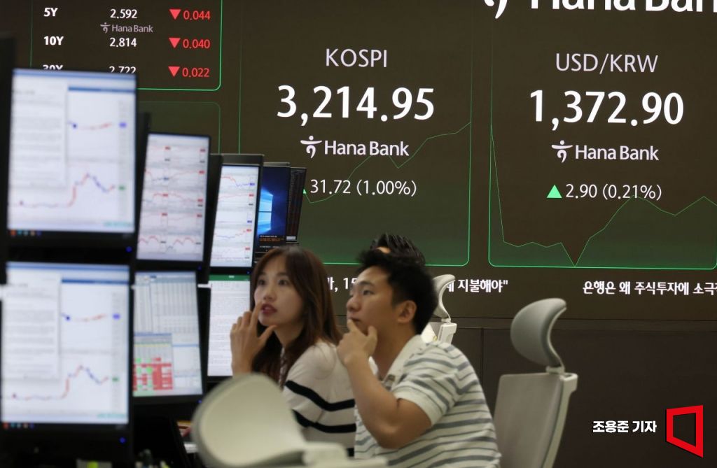 국내 증시 시가총액이 사상 처음으로 3000조원을 넘어선 가운데 코스피 지수도 3년10개월만에 3200선을 돌파 사상최고가를 기록한 11일 서울 중구 하나은행 딜링룸 모니터에 코스피 지수가 표시돼 있다. 이날 코스피는 전장보다 3.12포인트(0.10%) 오른 3,186.35로 출발했다.