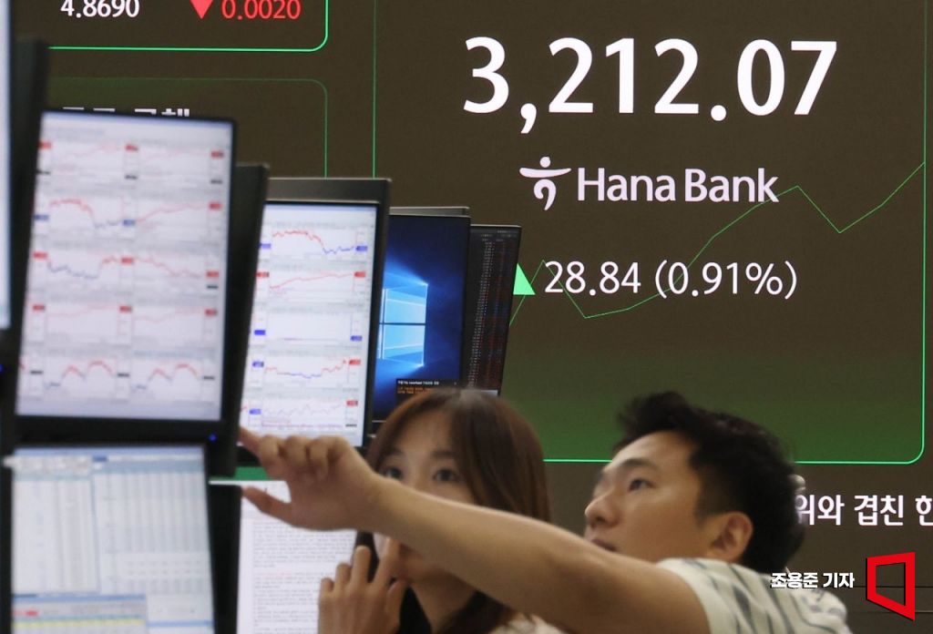 국내 증시 시가총액이 사상 처음으로 3000조원을 넘어선 가운데 코스피 지수도 3년10개월만에 3200선을 돌파 사상최고가를 기록한 11일 서울 중구 하나은행 딜링룸 모니터에 코스피 지수가 표시돼 있다. 이날 코스피는 전장보다 3.12포인트(0.10%) 오른 3,186.35로 출발했다. 2025.7.11 조용준 기자