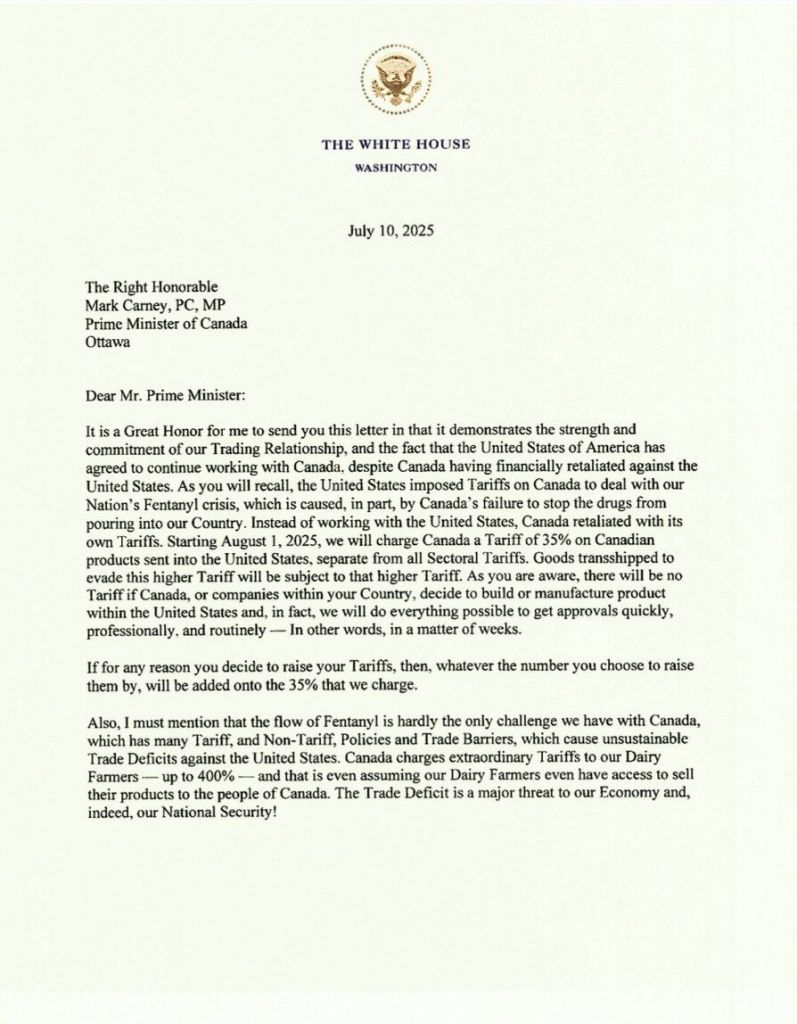 도널드 트럼프 미국 대통령이 10일(현지시간) 트루스소셜에 공개한 마크 카니 캐나다 총리 앞으로 보낸 관세 서한. 서한에는 8월1일부터 35% 상호관세율을 적용한다는 내용이 담겼다. 트럼프 대통령 트루스소셜