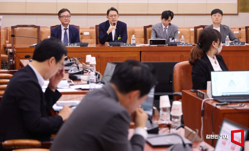 11일 국회 법제사법위원회 법안심사제1소위원회에서 열린 상법 추가 개정을 위한 공청회에서 김우찬 고려대 교수가 진술하고 있다. 왼쪽부터 정우용 한국상장회사협의회 정책부회장, 김우찬 고려대 교수, 최준선 성균관대 법학전문대학원 명예교수, 윤태준 주주행동플랫폼 액트 소장.