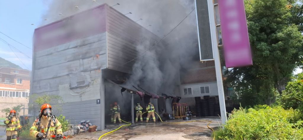 소방대원들이 타이어 판매점 화재를 진압하고 있다. 창원소방본부 제공