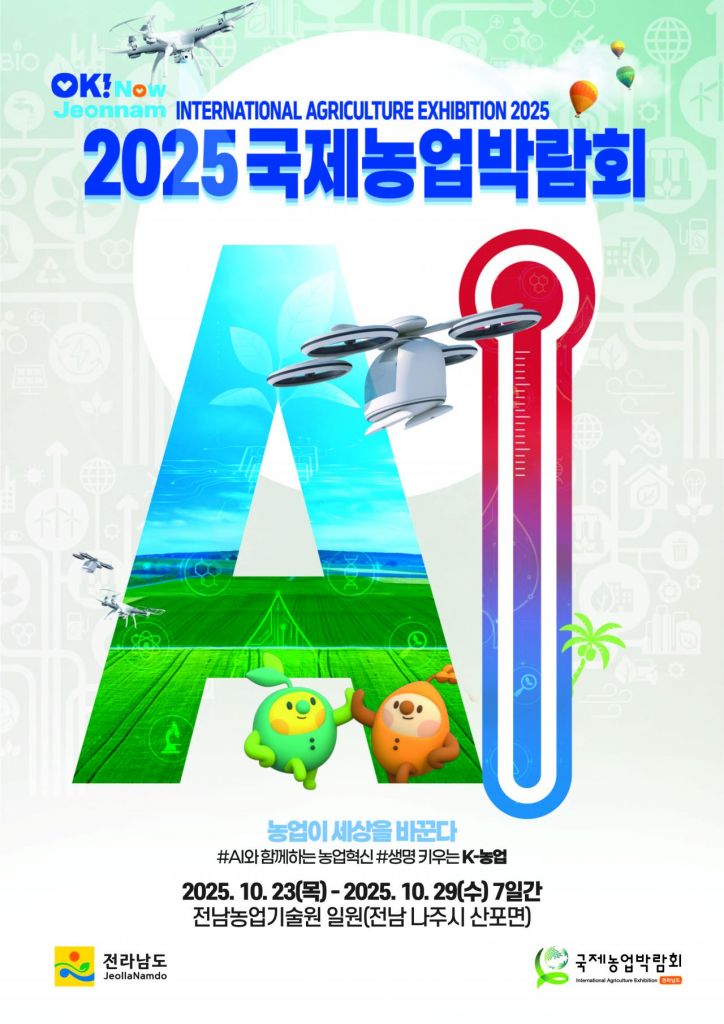 2025국제농업박람회는 오는 10월 23일부터 29일까지 나주 산포면 전남도농업기술원 일원에서 개최된다. 'AI와 함께하는 농업혁신, 생명 키우는 K-농업'을 주제로 미래 농업의 비전과 혁신 기술을 선보일 예정이다.