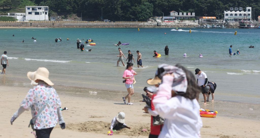 폭염이 이어진 12일 오후 경남 남해군 상주면 상주은모래비치에서 피서객이 물놀이하고 있다. 연합뉴스