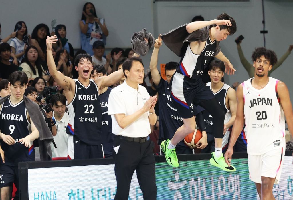 13일 2025 남자농구 국가대표 평가전 한국과 일본의 경기에서 안준호 감독과 선수들이 팀 득점 성공에 기뻐하고 있다. 연합뉴스