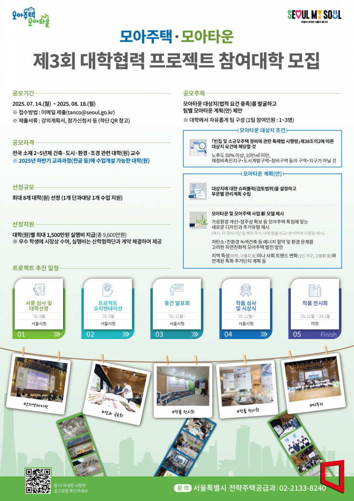 서울시는 '제3회 대학협력 모아주택·모아타운 프로젝트'에 참여할 대학을 다음달 18일까지 모집한다.