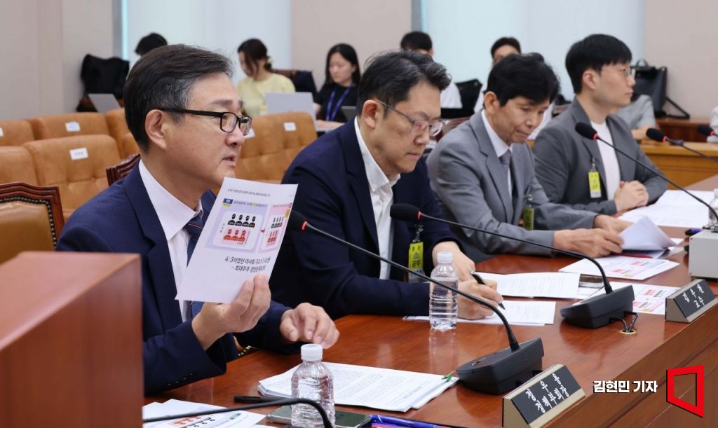11일 국회 법제사법위원회 법안심사제1소위원회에서 열린 상법 추가 개정을 위한 공청회에서 정우용 한국상장회사협의회 정책부회장이 진술하고 있다. 왼쪽부터 정우용 한국상장회사협의회 정책부회장, 김우찬 고려대 교수, 최준선 성균관대 법학전문대학원 명예교수, 윤태준 주주행동플랫폼 액트 소장. 2025.7.11 김현민 기자
