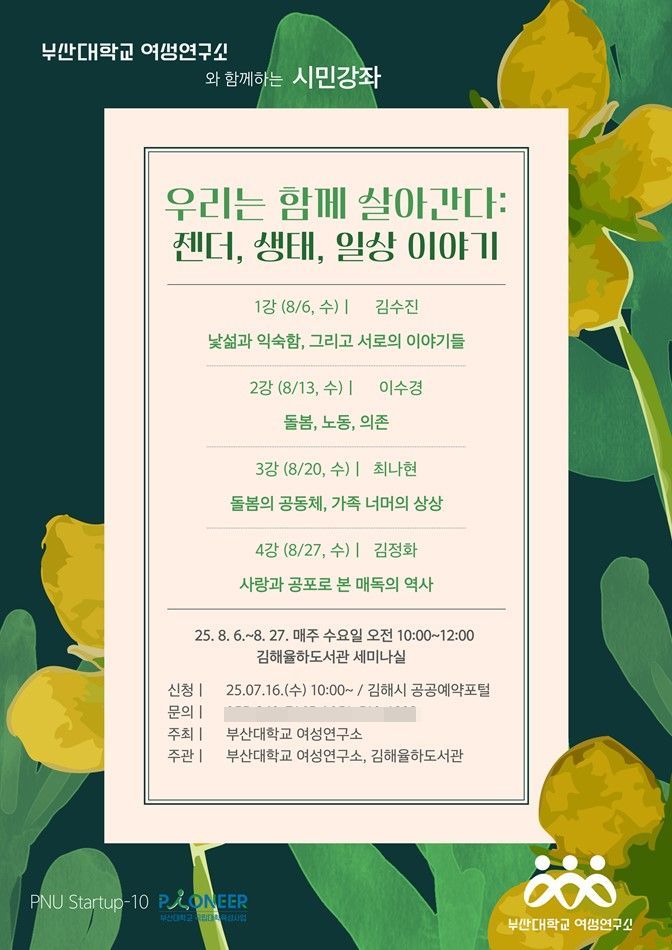 부산대학교(총장 최재원) 여성연구소는 오는 8월 한 달간 '우리는 함께 살아간다:젠더, 생태, 일상 이야기'를 주제로 시민강좌를 개최한다고 14일 전했다.