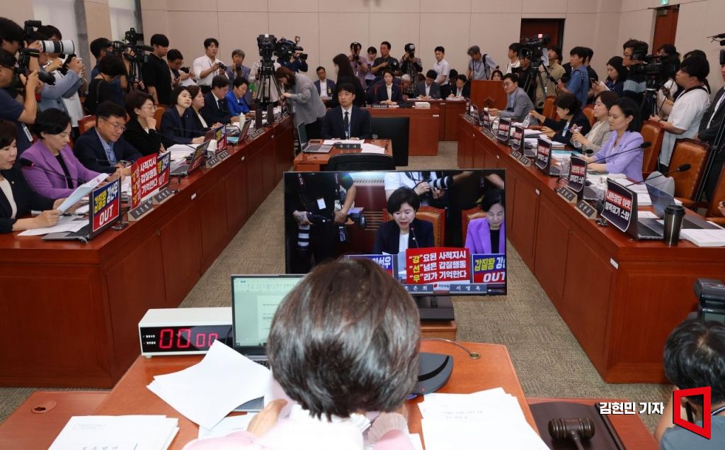 14일 국회 여성가족위원회에서 열린 강성우 여성가족부 장관 인사청문회에서 여야 의원석에 피켓이 붙어 있다. 2025.7.14 김현민 기자