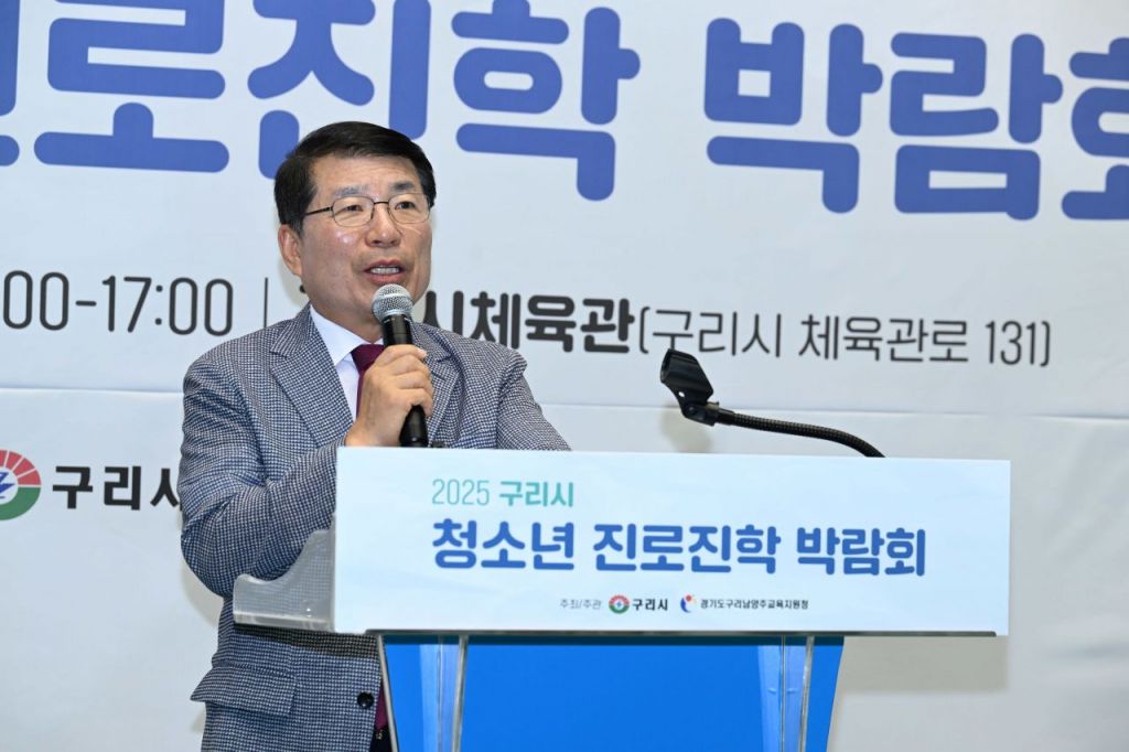 백경현 구리시장이 지난 11일 경기도구리남양주교육지원청과 공동 개최한 '2025년 구리시 청소년 진로진학박람회'에 참석해 인사말을 하고 있다. 구리시 제공