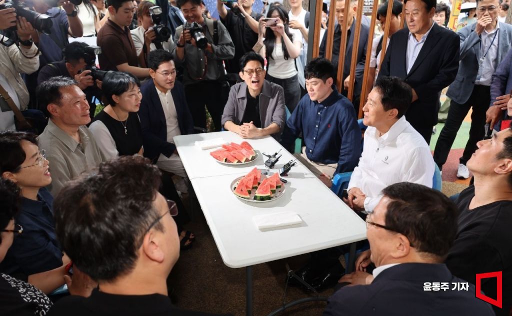 오세훈 서울시장이 14일 신속통합 재개발 지역으로 지정된 자양4동 A구역을 찾아 지역 주민들과 간담회를 갖고 있다.