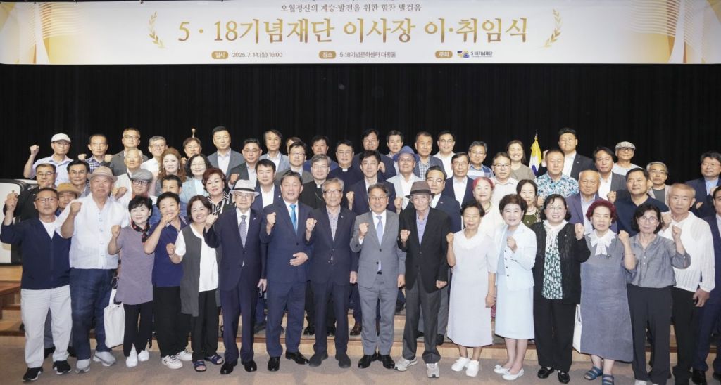 강기정 광주시장이 14일 오후 서구 5·18기념문화센터에서 열린 '5·18기념재단 이사장 이·취임식'에 참석해 윤목현 신임 이사장, 원순석 전임 이사장 등 참석자들과 기념촬영을 하고 있다. 광주시 제공
