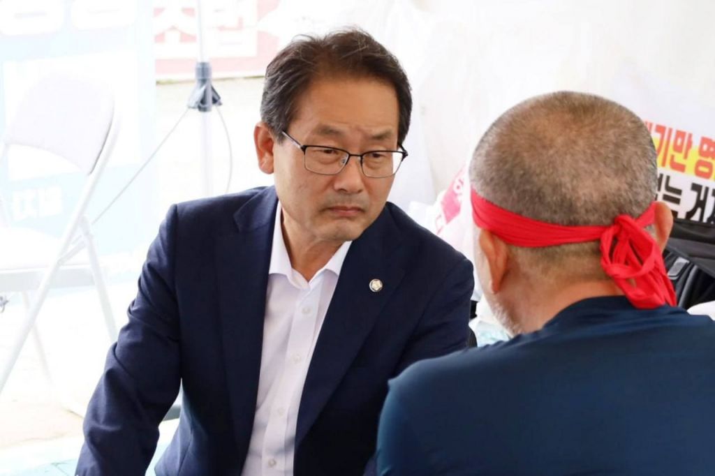 강준현 국회의원이 윤병철 해수부 노조위원장의 얘기를 듣고 있다. /사진= 강준현 의원 SNS